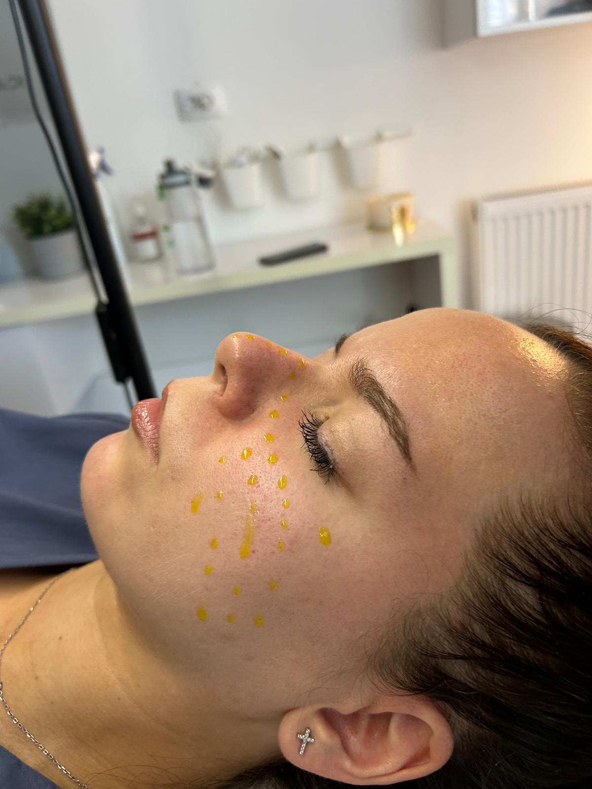 Aplicarea soluției BioRePeel pe piele – se lasă să acționeze câteva minute - Îndepărtarea produsului și aplicarea unei creme și seruri calmante BioReLift și BioReHydra