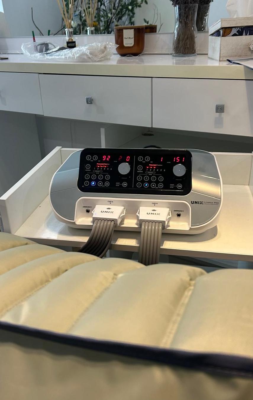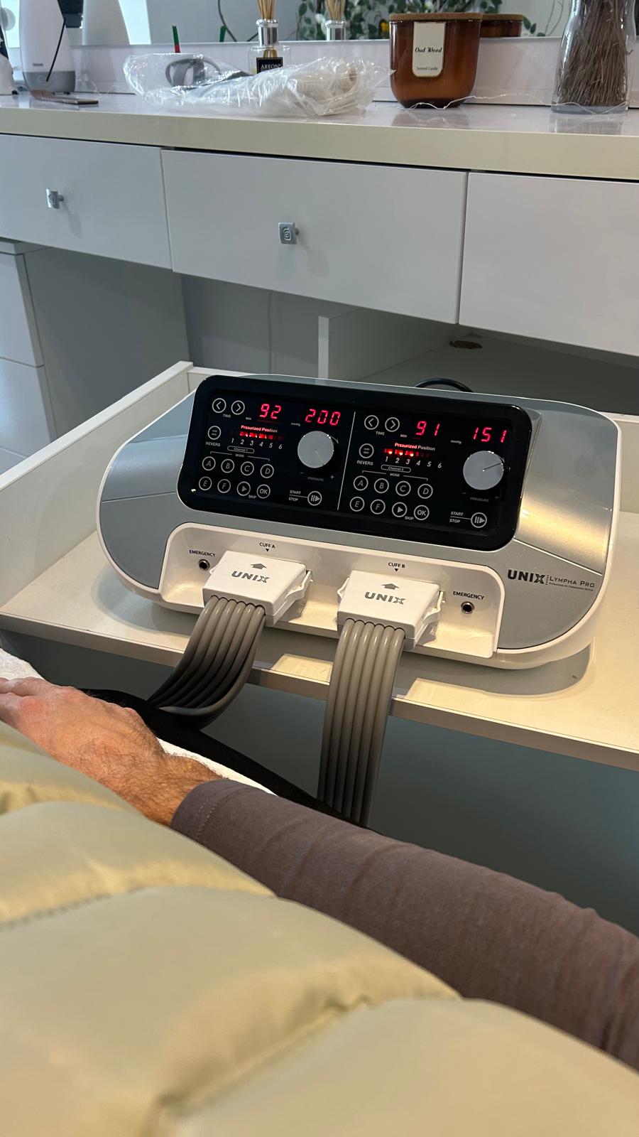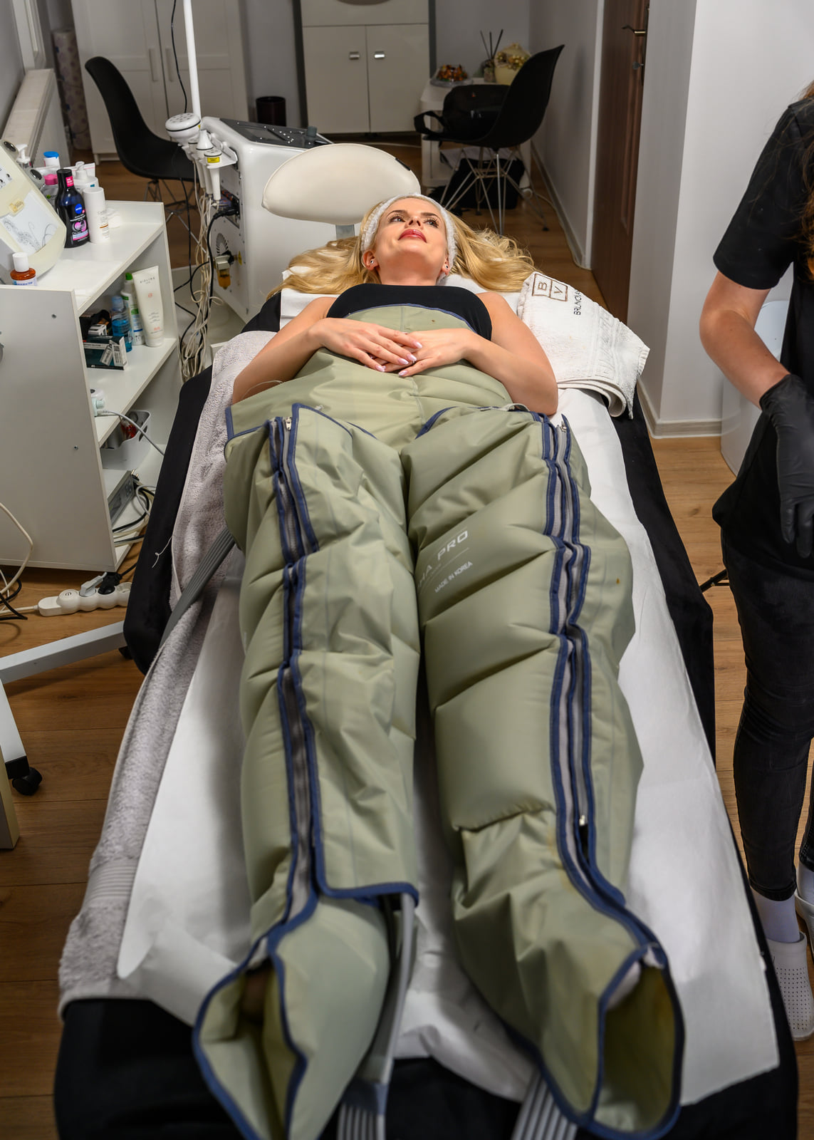 Se foloseste un aparat care funcționează pe bază de presoterapie. Acesta aplică presiuni controlate pe zona de picioare și abdomen, astfel că imită drenajul manual. Prin acest masaj se stimulează profund circulația limfatică și se elimină excesul de lichide și toxine.